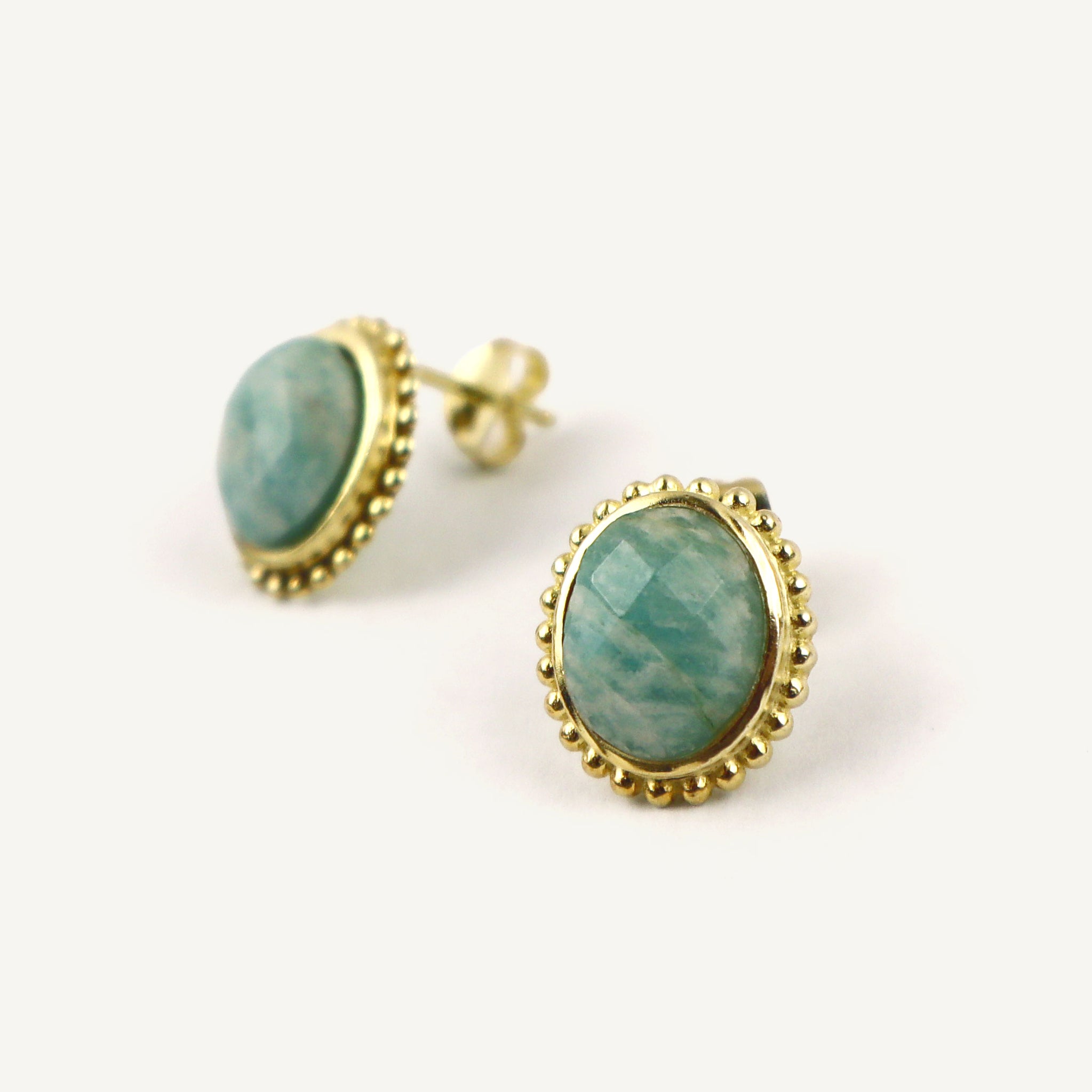 The Sophia Earrings combine amazonite stones with a .925 sterling silver base and gold finish, offering a naturally vibrant accent in a classic stud design.