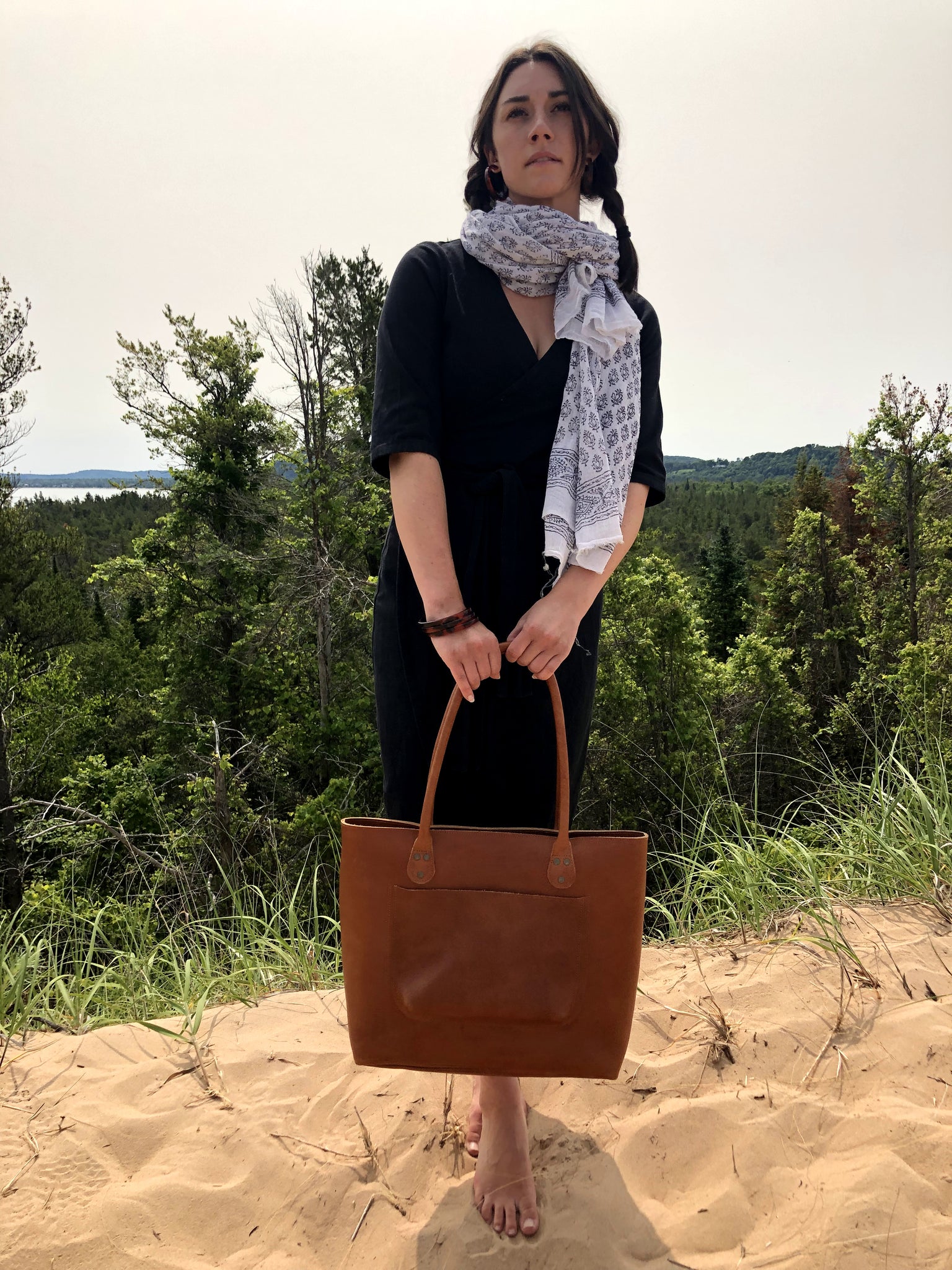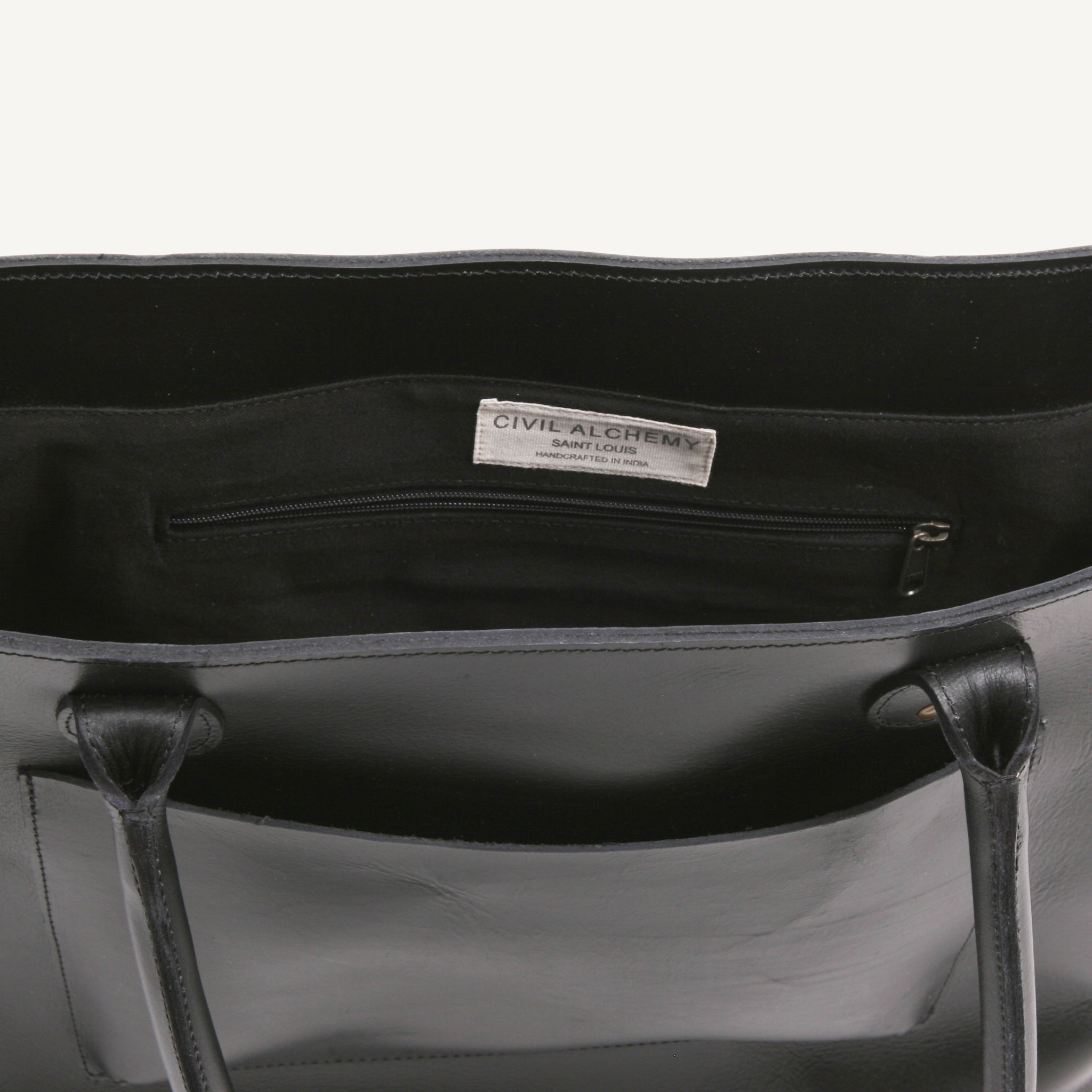 The Work Tote from Civil Alchemy is a timeless leather essential, designed to balance durability and function. Handmade in Ethiopia from top-grain leather with brass hardware, this tote features a lined interior, a large side pocket, and riveted thick handles cut from untreated leather that develops a rich patina over time. Available in Black or Tan, it offers both versatility and craftsmanship that stand the test of time.