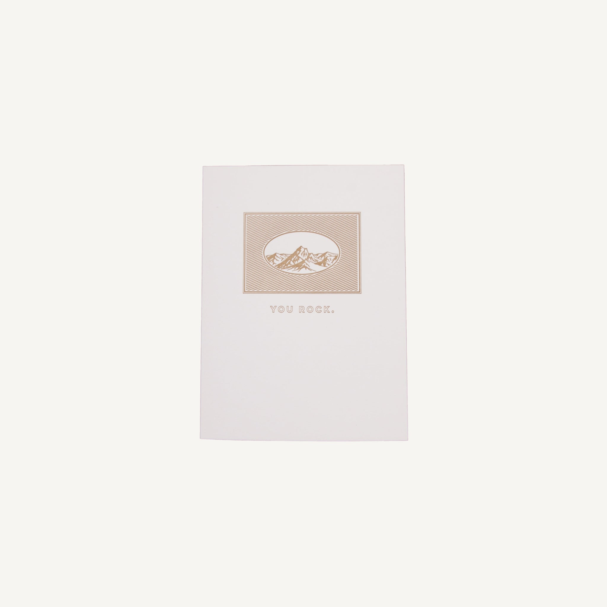 The You Rock Card by Civil Alchemy is a letterpress card printed and scored by hand just blocks from our shop in St. Louis. Designed in-house, it features a minimalist retro mountain range with the words “You Rock” on the front. Each card is crafted from heavyweight 80lb paper, comes with a recycled French paper envelope, and is packaged in a protective sleeve. Blank interior for personalized messages.